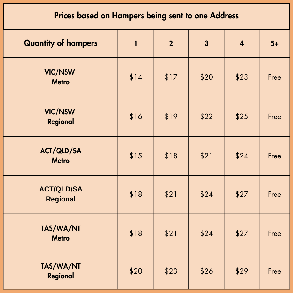 Shipping costs may vary depending on the destination, with different rates for Metro and Regional deliveries. Additionally, bulk orders with multiple hampers may qualify for discounted shipping rates. The final shipping cost will be calculated at checkout based on the delivery address and the number of hampers in your order.
