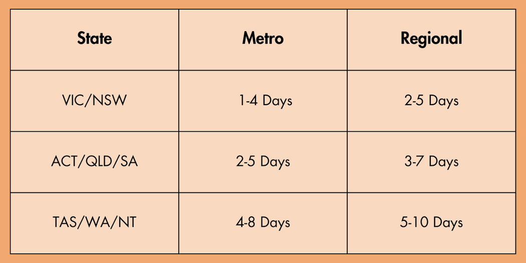 For Metropolitan areas it normally takes 1 to 4 Business days whereas for the Regional areas it takes 2 to 5 Business days depending on the states.